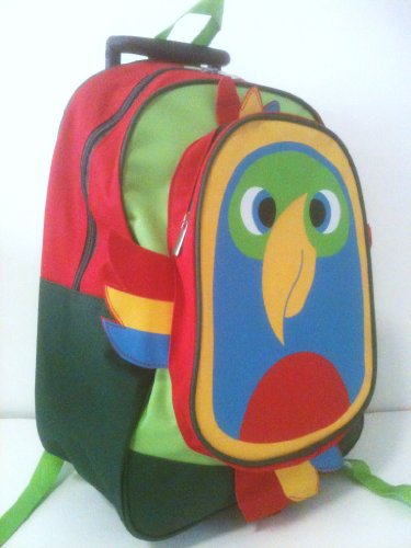 KIDS CAN WHEEL THIS BACKPACK AROUND WITH A RETRACTABLE HANDLE OR THEY CAN USE THE ADJUSTABLE SHOULDER STRAPS TO CARRY IT AS A BACKPACKPRACTICAL AND CONVENIENT.FEATURES :- DUAL ZIP MAJOR COMPARTMENT WHICH OFFERS PLENTY OF ROOM FOR BOOKS, CLOTHING OR TOYS.- ONE FRONT ZIP ROUND POCKET IN THE SHAPE OF CUTE PARROT WITH "FEATHER ON TOP".(9" W X 12" H). VERY CUTE & BEAUTIFUL.- ADJUSTABLE PADDED SHOULDER STRAPS.- TOP LIFT HANDLE- MATERIAL : CANVAS