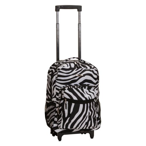 The Rockland Luggage 17 in. Rolling Backpack - Animal Print is a stylish carry-all that perfect for school, travel, and work. A telescoping pull-handle lets you store the piece easily, combining with the wheels to allow you to drag the piece at your leisure. The pack itself is made from durable polyester and is available in your choice of either: pink giraffe print, pink zebra print, or traditional zebra print. Two zipper pockets in front provide additional storage for small or delicate items and the interior mesh side-pockets. Dimensions: 13W x 10D x 17H inches. Comfortable telescoping handle. Spinner wheels allow 360-degree rotation. Pink giraffe/zebra and classic zebra patterns available. Made from durable polyester fabric. 3-year manufacturer's warranty.