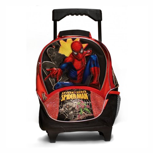 Make school super for your little hero with this fantastic Spiderman rolling toddler backpack This 12 inch book bag features Spiderman and the infamous villains Rhino and Green Goblin. This bag has plenty of storage space, including one main compartment for larger items, two front pockets for school supplies or small toys, a mesh pocket for a water bottle and a Velcro side pocket for holding small items. Padded, adjustable shoulder straps will help keep your child comfortable, and a sturdy popup handle extends to 22.5 inches for easy rolling. He'll love taking this bag to school, day care, play dates, overnight stays and moreSpiderman Spider Sense rolling backpack features Spiderman, Green Goblin, and Rhino Book bag features one main compartment, two front pockets, mesh side pocket and Velcro side pocket Padded, adjustable straps provide added comfort Bag measures 12"H x 4"W x 9"L Perfect backpack for school, travel and more